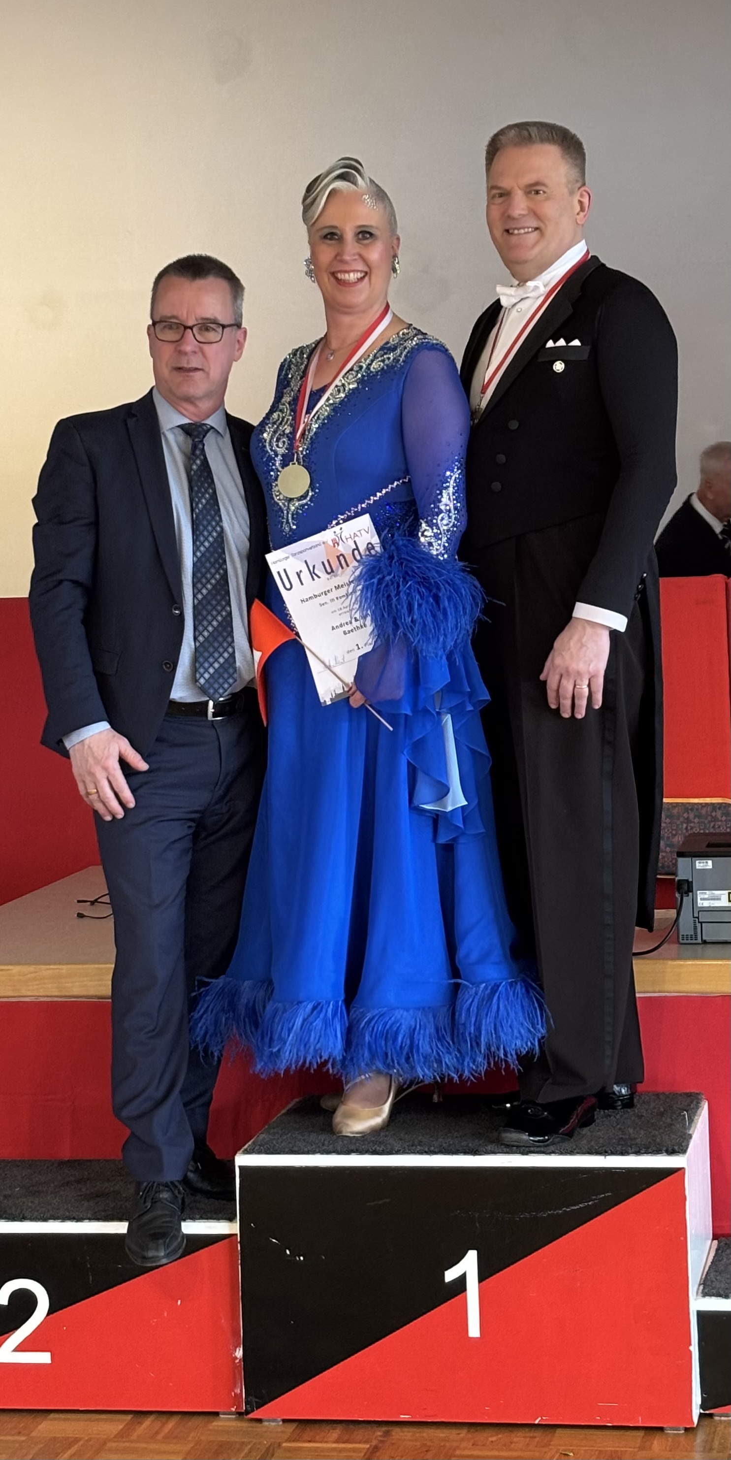 In der Senioren III Kombination gingen Jens und Andrea Baethke an den Start. Erfreulicherweise bot sich hier – im Vergleich zu den Vorjahren – ein verhältnismäßig großes Startfeld von zehn Paaren. Angefeuert von den zuschauenden Tänzerinnen und Tänzern des Club Saltatio präsentierten Jens und Andrea ihre zehn Tänze mit nur einer kurzen Umziehpause zwischen Latein und Standard. Die beiden konnten sich einige Kreuze sichern, verpassten jedoch knapp mit dem Anschlussplatz den Finaleinzug. Mit Platz 7 in der Gesamtwertung ertanzten sich Jens und Andrea den Hamburger Landesmeistertitel Senioren III Kombination 2026 und durften somit in der Landeswertung auf die höchste Stufe des Treppchens steigen.