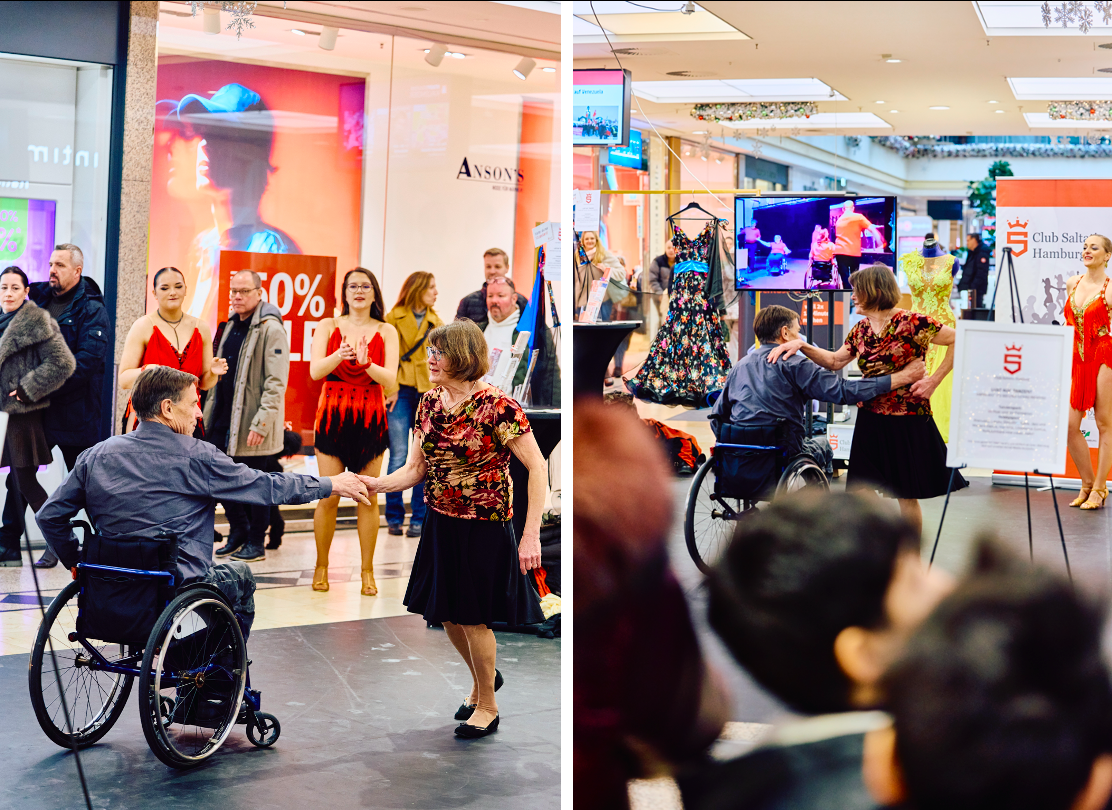 Direkt zu Beginn des neuen Jahres, am 4. Januar 2026, warfen sich unsere Latein-Formationstänzer/innen in Schale und präsentierten zusammen mit der Rollstuhltanzgruppe des Clubs Saltatio unseren Verein auf einer Tanzfläche der besonderen Art. Unter dem Motto „Sport und Gesundheit“ verwandelte sich das Alstertal Einkaufszentrum am ersten verkaufsoffenen Sonntag des Jahres in eine Shoppingwelt mit vielen sportlichen Mitmach-Aktionen. Mittendrin zwischen Schach, Functional Workouts und modernen Fitnesskonzepten zogen unsere Tänzerinnen der Latein-Solo-Formationen in ihren glitzernden Turnierkleidern immer mehr interessierte Besucher zum Zuschauen aber auch zum Mittanzen an. Bei bester Stimmung wurden zahlreiche Flyer verteilt, getanzt und erklärt, um einen Einblick in unsere vielfältigen tänzerischen Angebote zu vermitteln. Groß und Klein ließen sich nur allzu gerne zu einem Tänzchen auf unserer Fläche animieren - ein voller Erfolg!