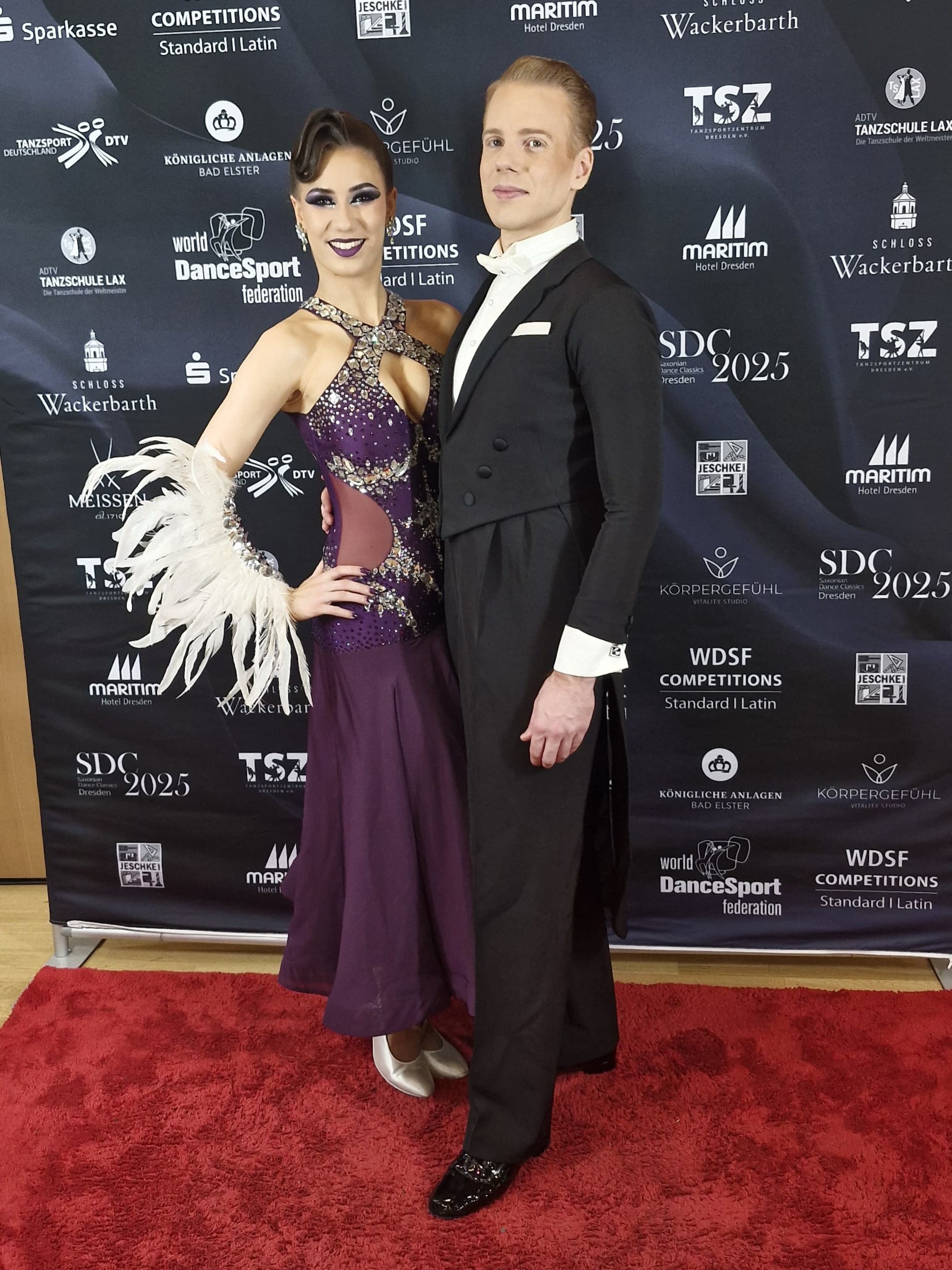 Nach einem gemeinsamen Essen und einem Erkunden der Dresdner Innenstadt mit anderen Hamburger Paaren am Vorabend des Turniers, starteten Niklas Bösch/Jenny Matthies am Samstag beim Deutschland Cup der Hauptgruppe A Standard. Für die beiden war das Turnier eine wichtige Gelegenheit, um sich im nationalen Vergleich mit altbekannten Paaren zu messen. Nach ihrem Auftritt in der mit 50 Paaren besetzten Vorrunde mussten sie das Turnier jedoch früher als erhofft beenden und verfolgten das weitere Geschehen von den Zuschauerrängen aus. Niklas fasste ihre Stimmung treffend zusammen: „Gerade bei einer so weiten Anreise hatten wir uns mehr erhofft. Ein zweites Mal tanzen wäre schön gewesen.“ Trotz des unerwarteten Ausgangs genossen die beiden die gelungene Organisation und die charmante Dekoration der Veranstaltung. Und wer sich wie die beiden regelmäßig starker Konkurrenz stellt, wächst mit jedem Turnier ein Stück und blickt mit neuen Trainingsimpulsen und Entwicklungsmöglichkeiten nach vorne.