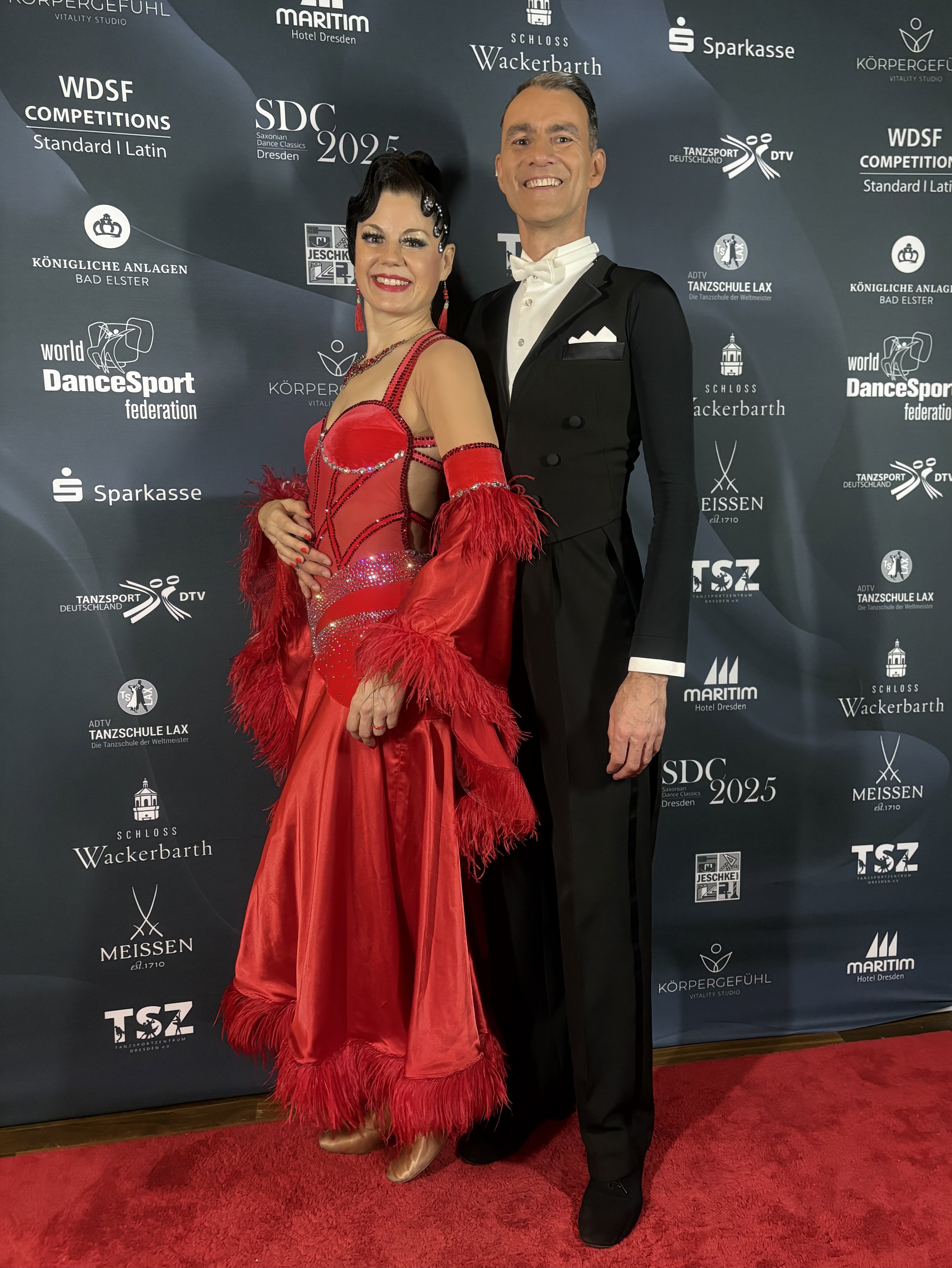 Am Sonntag traten Tilo und Barbara Kornak im WDSF Open Standard der Masters III an. Mit 143 Paaren aus aller Welt war dies eines der größten Felder des Wochenendes. Mit großer Ausdauer und Konzentration tanzten sie sich über mehrere Stunden hinweg bis in die vierte Zwischenrunde vor. Dabei ging es zeitweise auf der Fläche etwas lebhafter und ruppiger zu, da sich diese bis zu 13 Paare gleichzeitig teilten. Die beiden schlugen sich ausdrucksstark durch und erreichten nicht nur ihr Wunschziel, die 24er-Runde, sondern übertrafen es mit einem geteilten 16./17. Platz sogar deutlich. Dieses beeindruckende Ergebnis ist Ausdruck von Disziplin, Ausdauer und Leidenschaft und ein schöner Lohn für die vielen Trainingsstunden. Barbara fasst das Wochenende zusammen: „Dresden ist immer eine Reise wert. Wir haben dieses Turnierwochenende mit Stadtbesichtigung, leckerem Essen und Opernbesuch neben dem Tanzen zu einem kleinen Kurzurlaub gemacht.“
