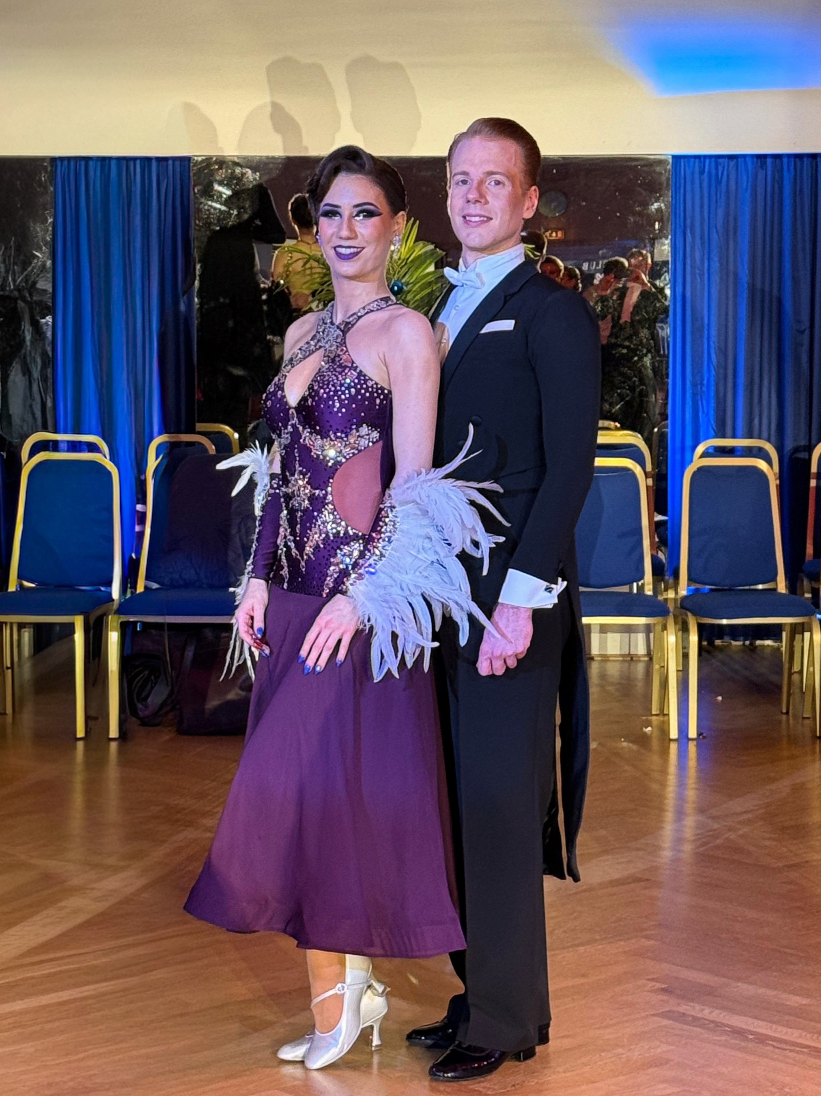 Niklas Bösch/Jenny Matthies rundeten den Turniertag am Samstag in der Hauptgruppe A Standard ab. In einem kleinen Feld von vier Paaren präsentierten sie sich gewohnt harmonisch und eingespielt. Besonders berührend war der Moment am Ende des finalen Quickstep, als Niklas Jenny spontan einen Kuss auf die Wange gab, um ihre gemeinsame Freude am Tanzen sowie ihre Wertschätzung füreinander sichtbar zu machen. Nach Ende des Turniertags verlangte es die von ihnen ins Leben gerufene Tradition, dass es für alle Saltatio-Paare und Freunde gemeinsam auf den Weihnachtsmarkt ging, ein liebgewonnenes Ritual, das jedes Jahr aufs Neue für freudige Gesichter, gute Gespräch und fröhliche Weihnachtsstimmung sorgt.