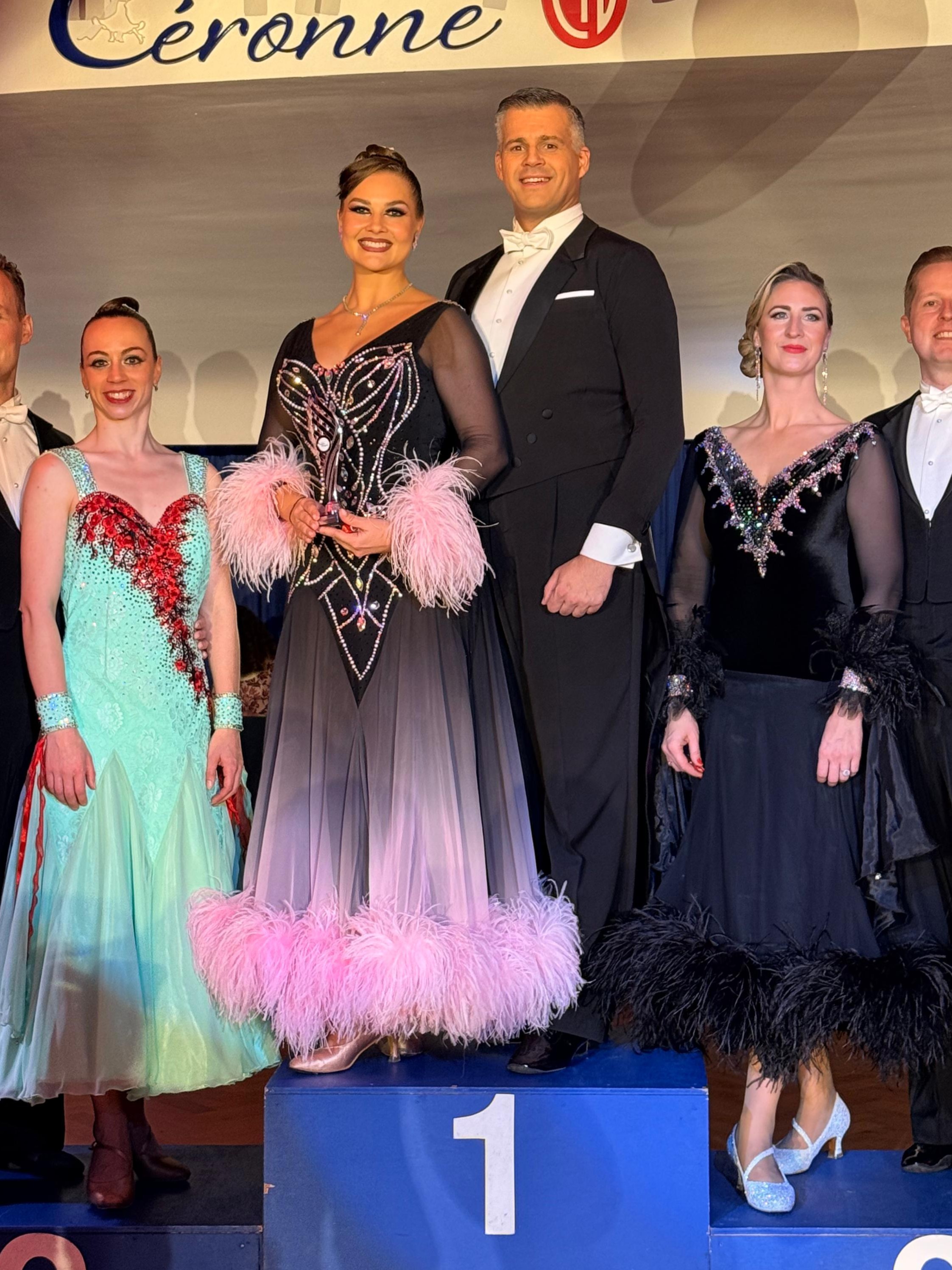 Bei den Masters I A Standard setzten Thiemo Meyer/Sandra Lemburg ein echtes Glanzlicht. Schon in der Sichtungsrunde zeigten sie eine beeindruckend elegante und stabile Leistung, die sich klar von der Konkurrenz abhob. Im Finale wuchs unser Paar noch einmal über sich hinaus, sodass die offene Wertung fast nur Einsen zeigte und auch für das Publikum ihre Qualität umso deutlicher hervorhob. So klatschten die Zuschauenden bei jedem Tanz unermüdlich und unüberhörbar für unser Tanzpaar und auch Sandras Freundinnen und Partner jubelten den beiden begeistert zu. Zahlreiche Umarmungen und Glückwünsche begleiteten zum Schluss ihren herausragenden Turniersieg samt glänzendem Pokal, den sie mit einem Strahlen entgegennahmen, das kaum heller hätte sein können.