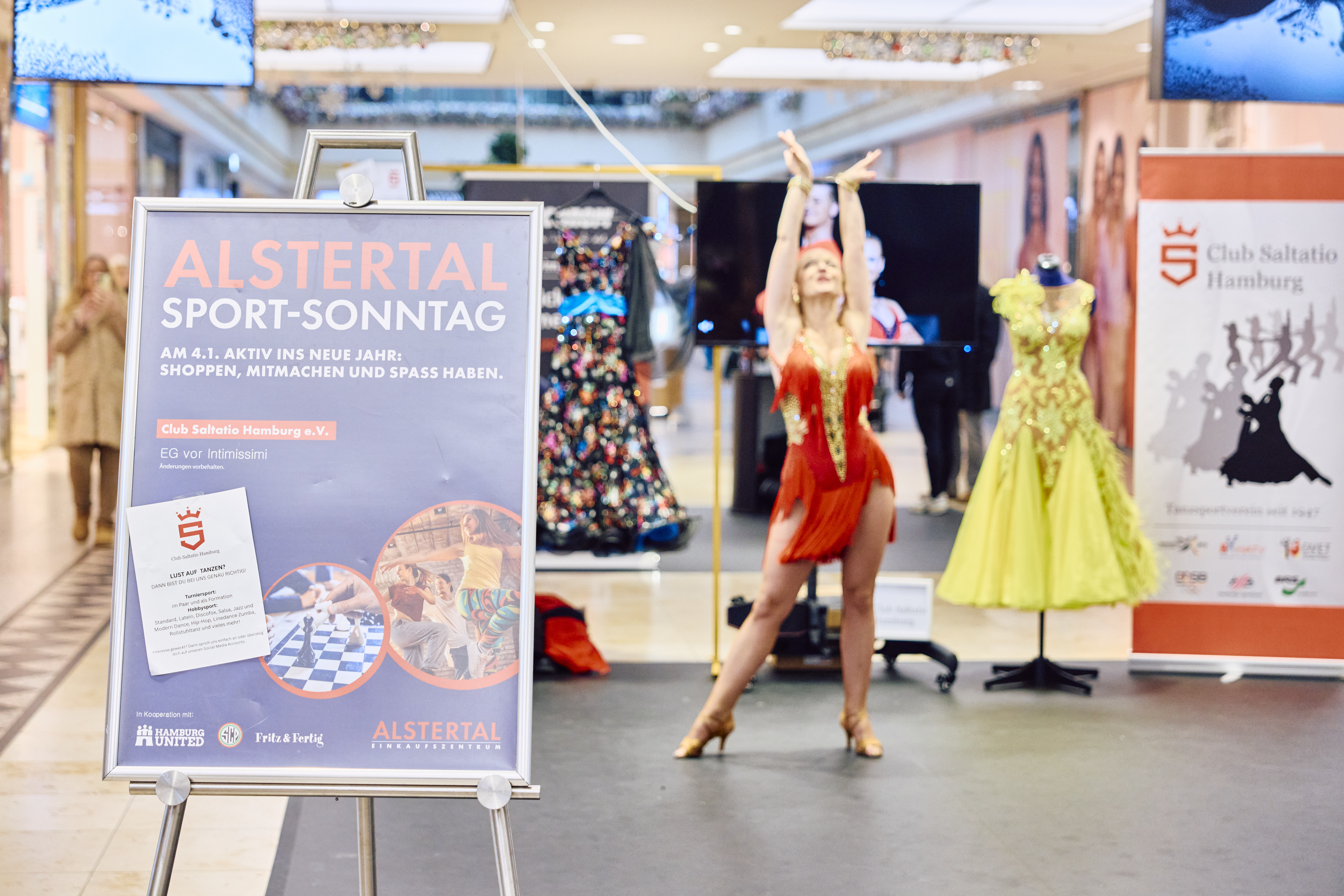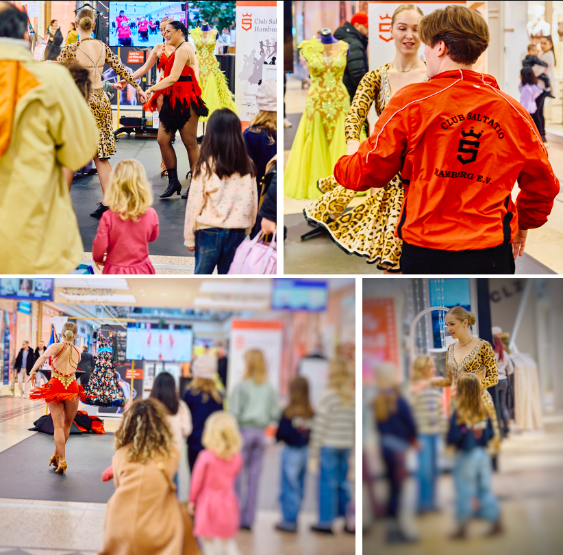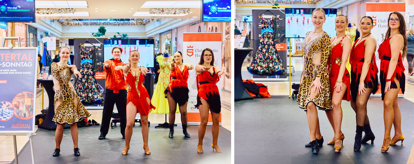 Direkt zu Beginn des neuen Jahres, am 4. Januar 2026, warfen sich unsere Latein-Formationstänzer/innen in Schale und präsentierten zusammen mit der Rollstuhltanzgruppe des Clubs Saltatio unseren Verein auf einer Tanzfläche der besonderen Art. Unter dem Motto „Sport und Gesundheit“ verwandelte sich das Alstertal Einkaufszentrum am ersten verkaufsoffenen Sonntag des Jahres in eine Shoppingwelt mit vielen sportlichen Mitmach-Aktionen. Mittendrin zwischen Schach, Functional Workouts und modernen Fitnesskonzepten zogen unsere Tänzerinnen der Latein-Solo-Formationen in ihren glitzernden Turnierkleidern immer mehr interessierte Besucher zum Zuschauen aber auch zum Mittanzen an. Bei bester Stimmung wurden zahlreiche Flyer verteilt, getanzt und erklärt, um einen Einblick in unsere vielfältigen tänzerischen Angebote zu vermitteln. Groß und Klein ließen sich nur allzu gerne zu einem Tänzchen auf unserer Fläche animieren - ein voller Erfolg!