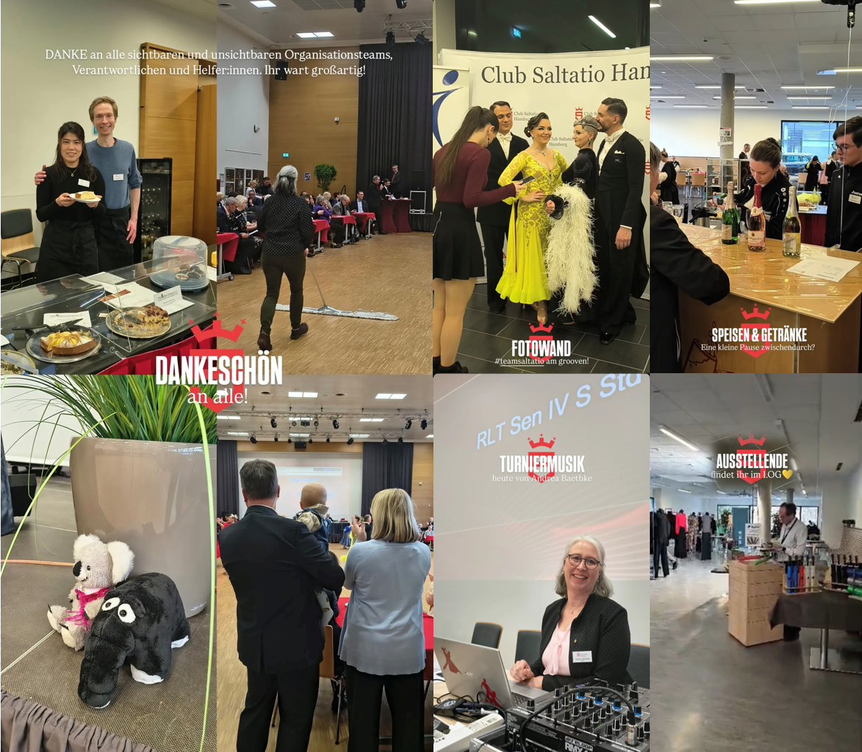 Ebenfalls immer zur Stelle waren das grandiose Organisationsteam und die zahlreichen Helfer des Clubs Saltatio, die ihr Bestes gaben, um für alle Tanzpaare diese Turnierveranstaltung zu einem besonderen Erlebnis zu machen. Zusätzlich zu ihren vielfältigen Aufgaben ließen sie es sich natürlich nicht nehmen - wann immer möglich - unsere Paare auf der Tanzfläche anzufeuern und mit viel Applaus zu Bestleistungen anzuspornen. Vielen Dank für eure Unterstützung!